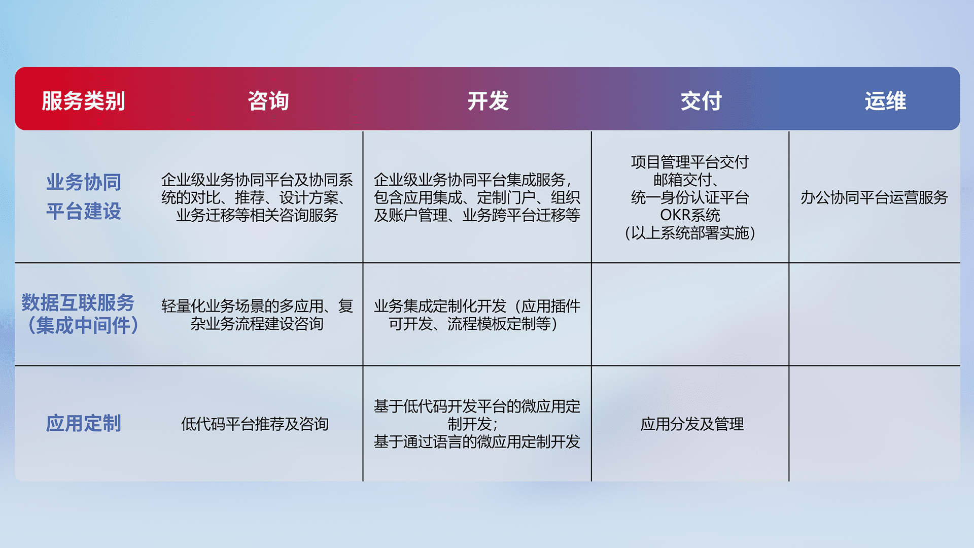 针对钉钉、、企微、、、、IDaas等平台级产品提供产品的规划、、、、方案、、、交付、、、定制化开发等服务,,实现如统一协同办公、、、智能客户服务、、、、混合会议管理、、、智能数据查询、、、等业务场景,,实现数字化转型。。。。